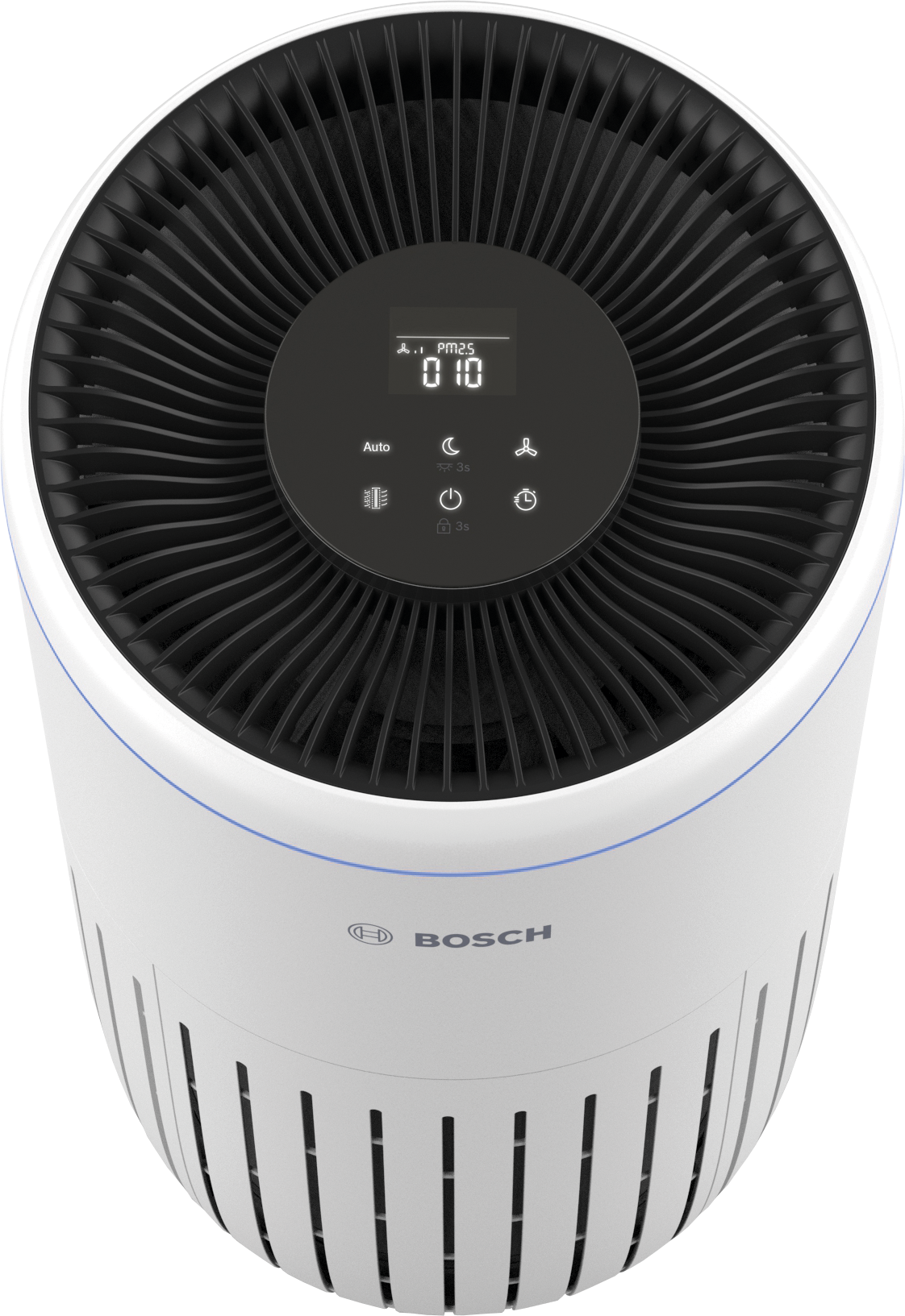 Die aktuelle Luftqualität wird kontinuierlich über einen Farbcode (Blau, Violett, Orange, Rot) im LED-Leuchtring angezeigt. Zudem verfügt der Air 4000 über ein LED-Touchdisplay mit 6 Tasten zur einfachen Auswahl der Modi. Die Interaktion mit dem Luftreiniger von Bosch ist intuitiv und selbsterklärend.