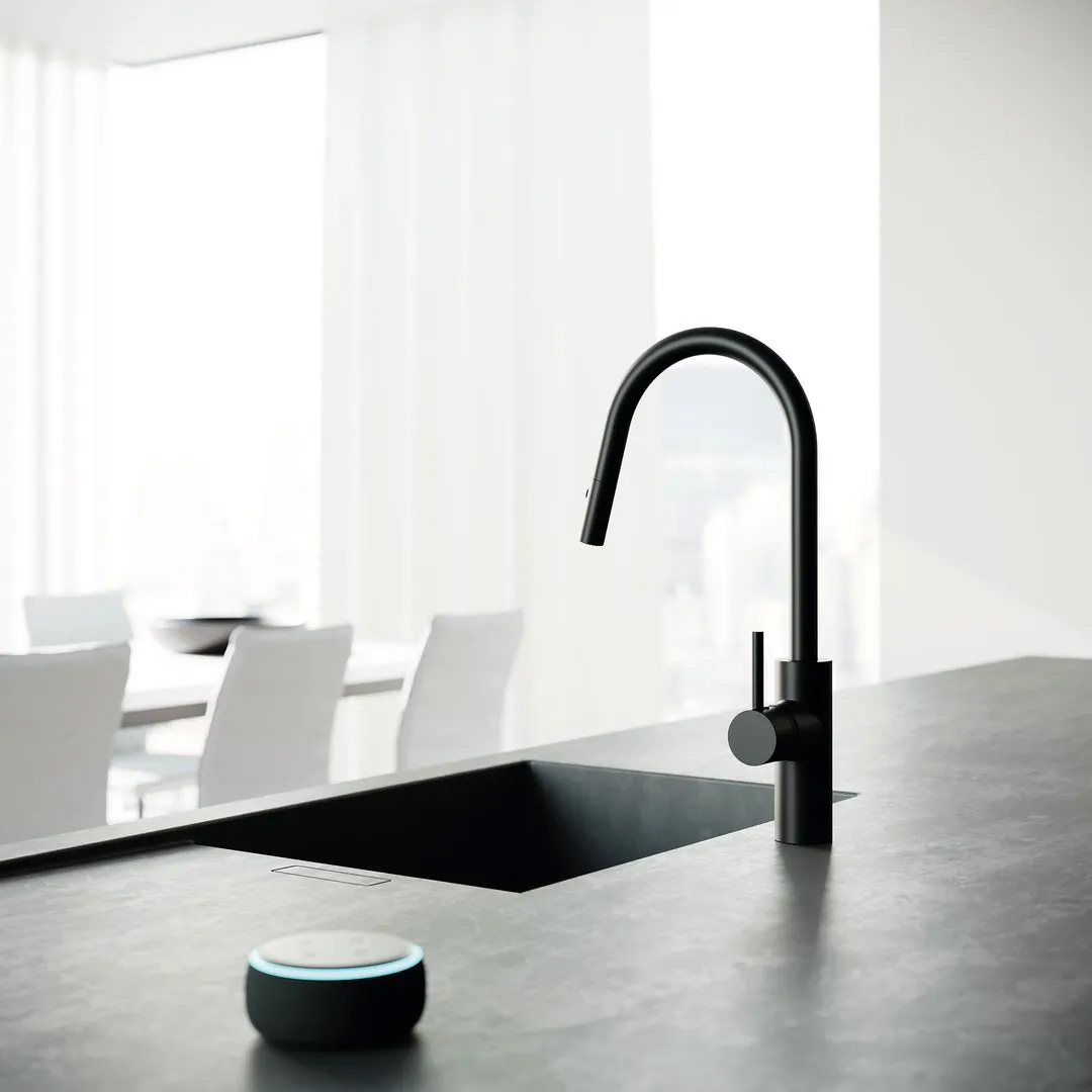 Hingucker an der Küchenspüle: Mit ihrer hochgewachsenen Gestalt und ihrem filigranen Design zieht Kludi-E-GO Voice die Blicke auf sich. Dies gilt vor allem für die Varianten in edlem Mattschwarz oder angesagtem Mattweiß. Besonders praktisch für die Küchenarbeit: die herausziehbare Geschirrbrause mit zwei Strahlarten.